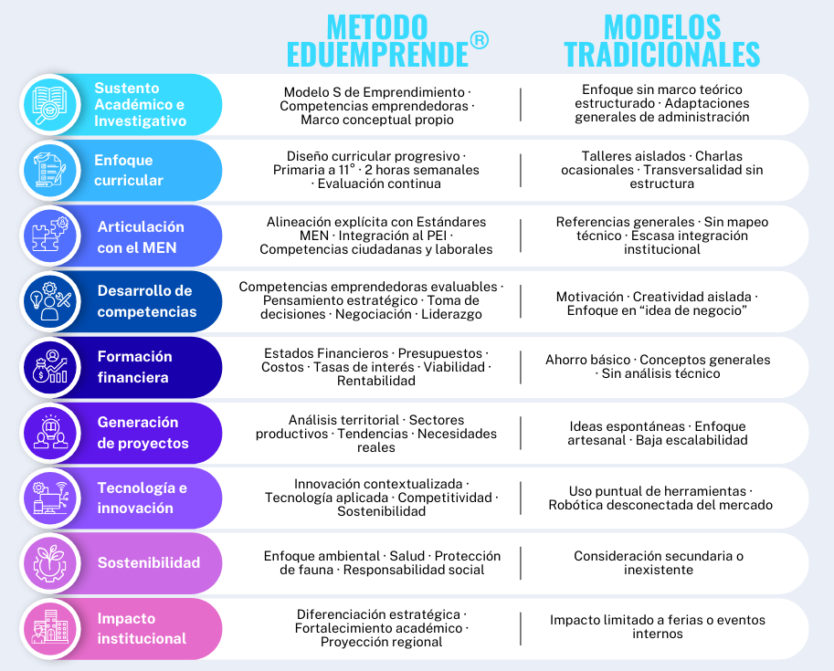 La propuesta de Eduemprende se fundamenta en un marco conceptual propio, desarrollado y consolidado a lo largo de más de dos décadas de experiencia en formación empresarial escolar: el Modelo S® – Marco conceptual del emprendedor integral, y su implementación metodológica a través del Modelo 4C® – Arquitectura pedagógica progresiva.